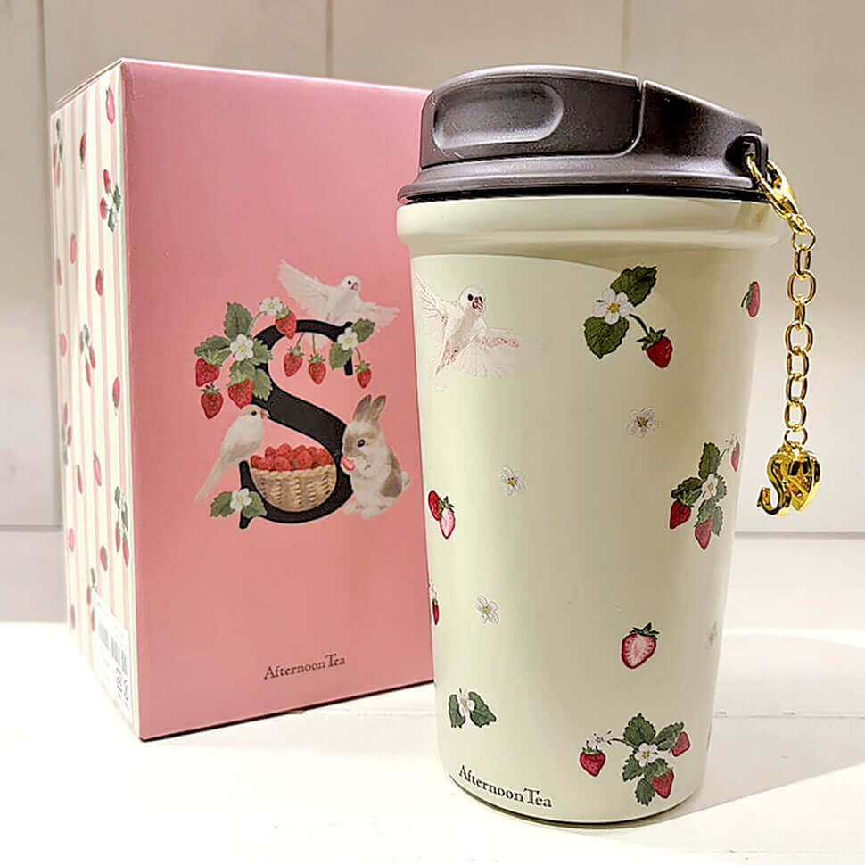 艶消しのマットな感じが優しい手書きのイラストにマッチします。イニシャルステンレスタンブラーは全てチャーム付き。蓋についたフックには、違うアクセサリーもつけられます。ステンレス製の二重構造のタンブラーで保温・保冷とも利用可能。