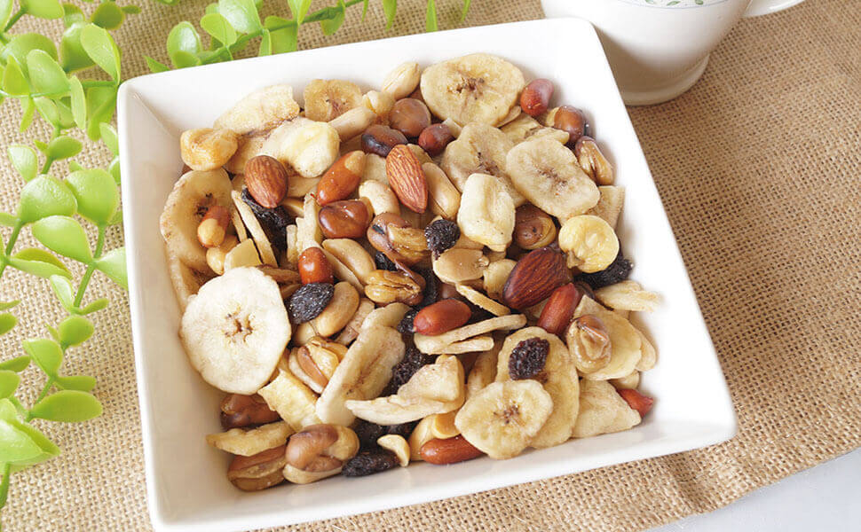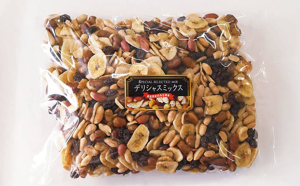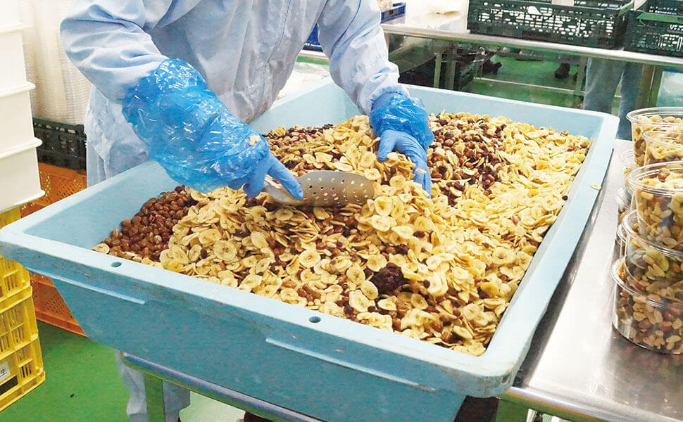 落花生やアーモンドのほか、オレンジやマンゴー、パイナップルといったさまざまなドライフルーツは工場で袋やカップに詰めます。バナナチップスやレーズン、バターピーナッツなど7品目を工場で混合させたオリジナルのバラエティカップ「デリシャスミックス」は看板商品です。