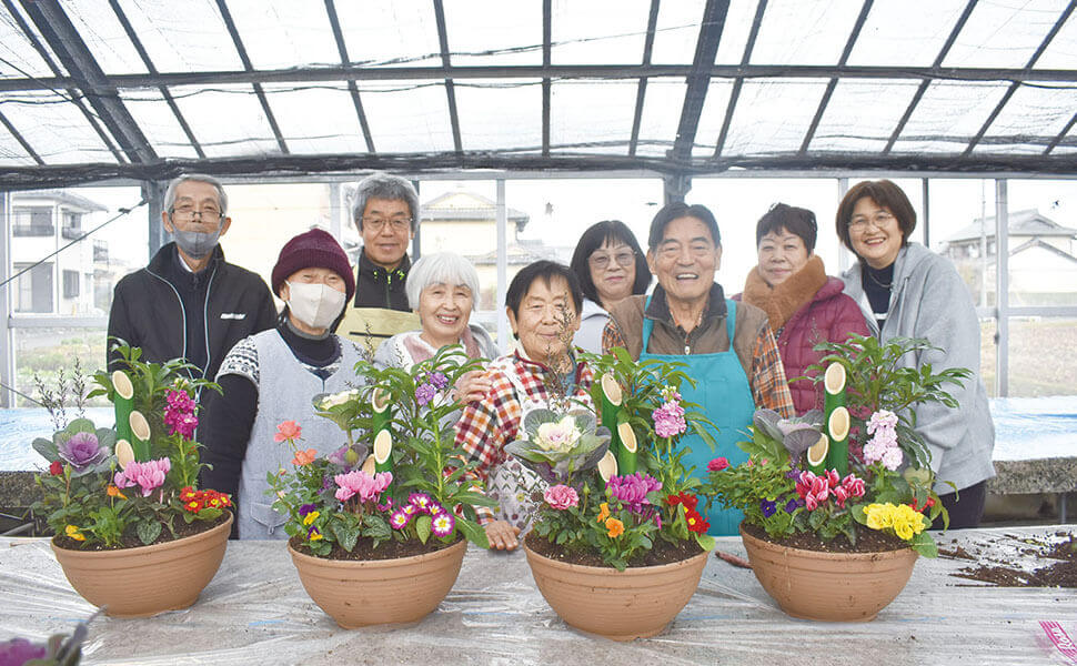 お正月を迎える 寄せ植え教室【9種類の縁起物や花々を華やかに植えて正月飾りに】 「上手に仕上がりました。これで良いお正月を迎えることができます!」参加者6人と講師3人。右から3人目が講師の林... -
