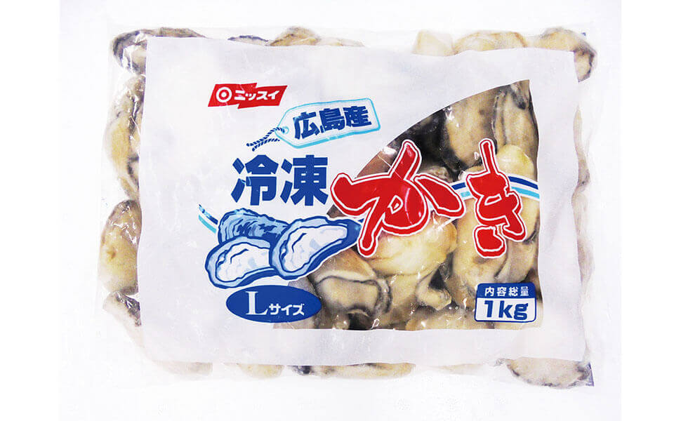 Lサイズの大ぶり冷凍牡蠣が1kg入った大容量パックです。加熱してからお召し上がりください。