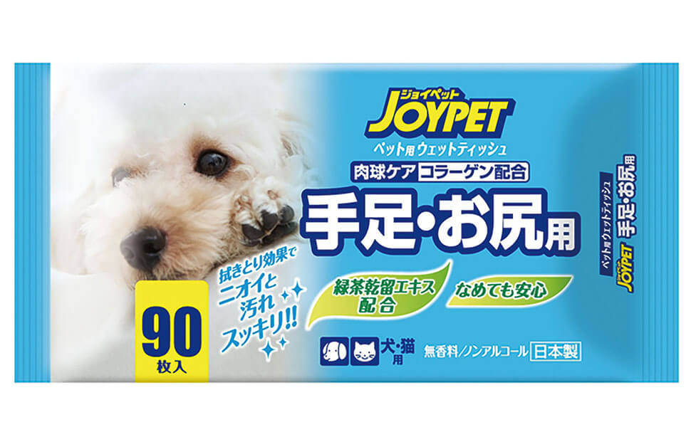 ペットのお散歩後の手足やおしりふきに便利。肌に優しい弱酸性。緑茶乾留エキス、コラーゲン配合。