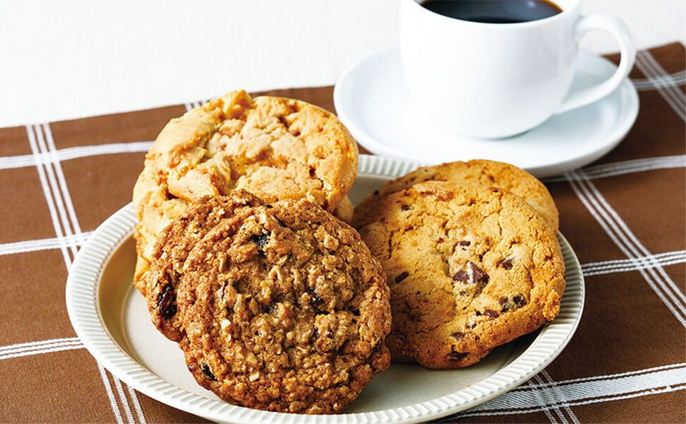 ダークチョコレート、レーズンオートミール、イングリッシュトフィー、3種類のフレーバーが楽しめます。直径は約10cm程、厚みが1cm程の大きなソフトクッキーです。大きなチョコとしっとりした生地、甘くて香ばしいシロップを固めたトフィー、シリアルやレーズンのザクザクした食感が特徴です。