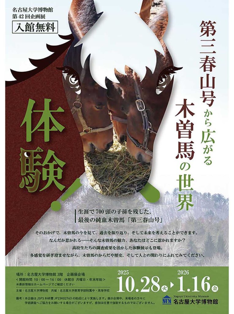 生涯で700頭の子孫を残した、最後の純血木曽馬「第三春山号」。そのおかげで、木曽馬の今を見て、過去を振り返り、そして未来を考えることができます。なんだか惹かれるー。そんな木曽馬の魅力、あなたはどこに惹かれますか?高校生たちの調査成果を活かした体験展示も登場。多感覚を研ぎ澄ませながら、木曽馬のからだや歴史、そして人との関わりにふれてみてください。