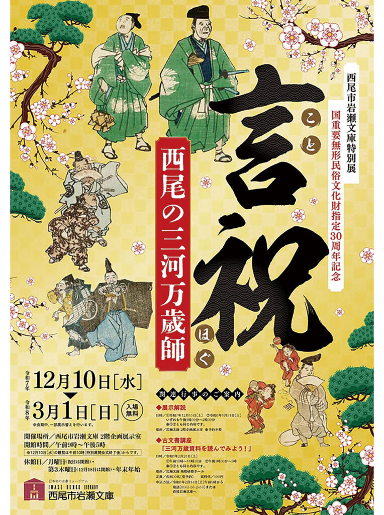 三河万歳は太夫(たゆう)と才蔵(さいぞう)による軽快な掛け合いで新春の福を祝う伝統芸能で、その源は江戸時代以前に遡ります。太夫と才蔵による祝福芸は現在の漫才のルーツともされ、多くの人に福と笑いを届けてきました。本展では、市内の万歳師が残した史料を中心に紹介します。