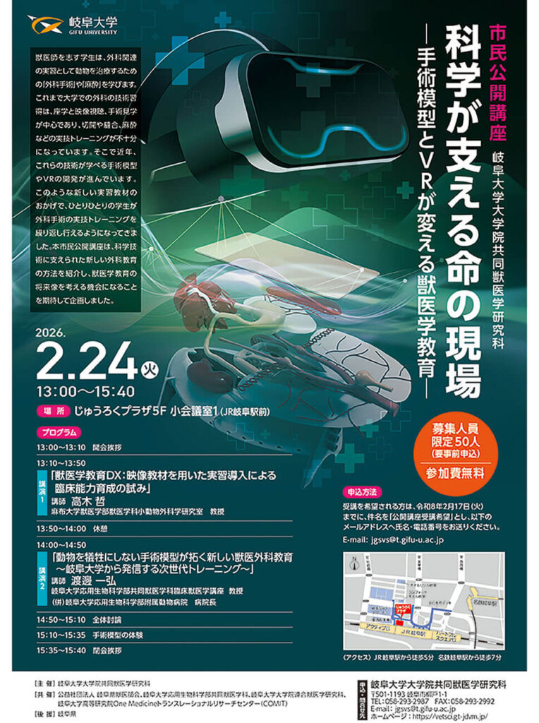 獣医師を目指す学生の外科教育は、従来、座学や見学が中心でしたが、近年は手術模型やVRの導入により実技訓練の環境が整ってきました。本講座では、こうした新しい外科教育と獣医学教育の将来を紹介します。