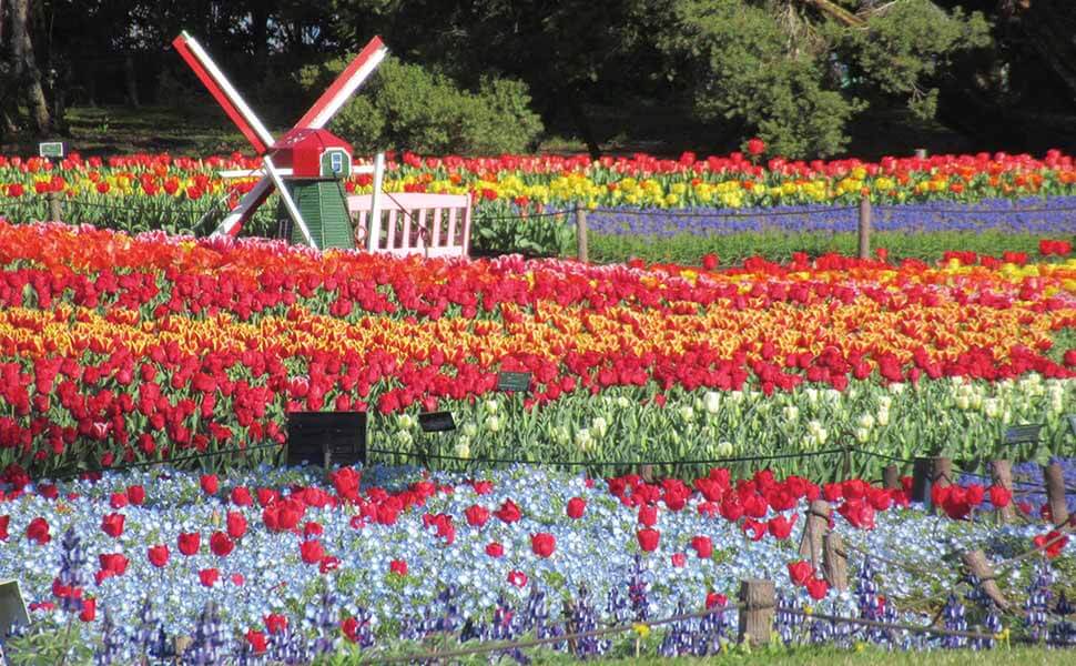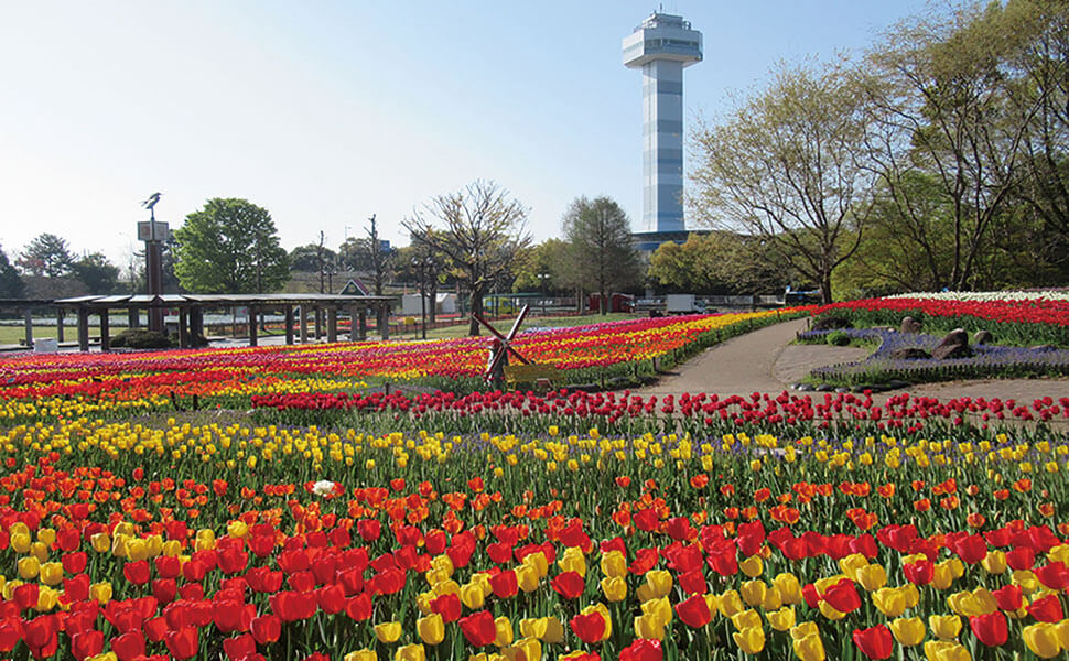 赤、白、ピンク…色とりどりのチューリップがダイナミックな絵を描く大花壇が人気。桜やネモフィラなど春のお花も楽しめます。期間中は話題のキッチンカーや軽食の売店があり、食も充実。子どもから大人まで楽しめる体験教室もあり、家族で春の一日を満喫できます。