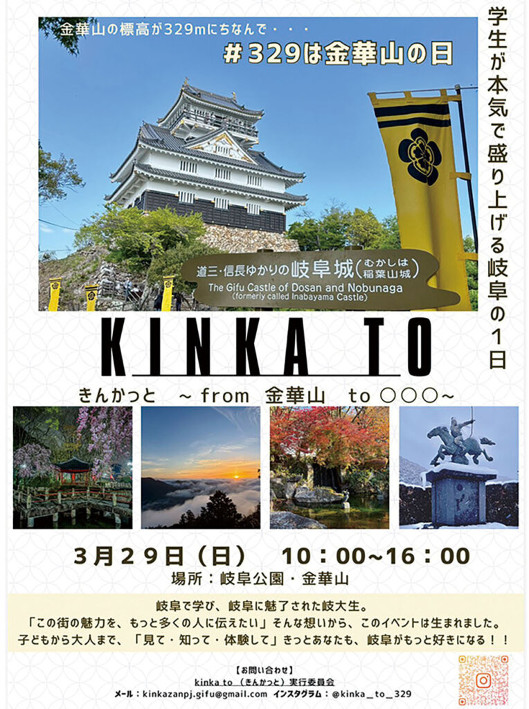 3月29日は金華山の日!金華山・岐阜公園周辺で学生主体の体験型イベント「Kinka to(きんかっと)」を開催します。金華山を“登る・知る・体験する”をテーマに、ガイド付き登山やクイズラリー、歴史講話、ワークショップ、ステージ企画、キッチンカーなど内容盛りだくさん!親子から大人まで、世代を超えて岐阜の魅力を再発見できる一日です。ぜひご参加ください。