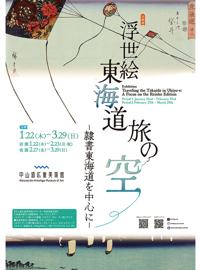 「東海道五拾三次之内」の大ヒットから10年余りが経ち円熟期に入った広重による名作「隷書東海道」は、広角の構図と鮮やかな摺りで東海道の旅情を描いたシリーズ。本展では全55図に加え、他の東海道作品も展示し、皆さまを江戸時代の旅の空へとご案内します。