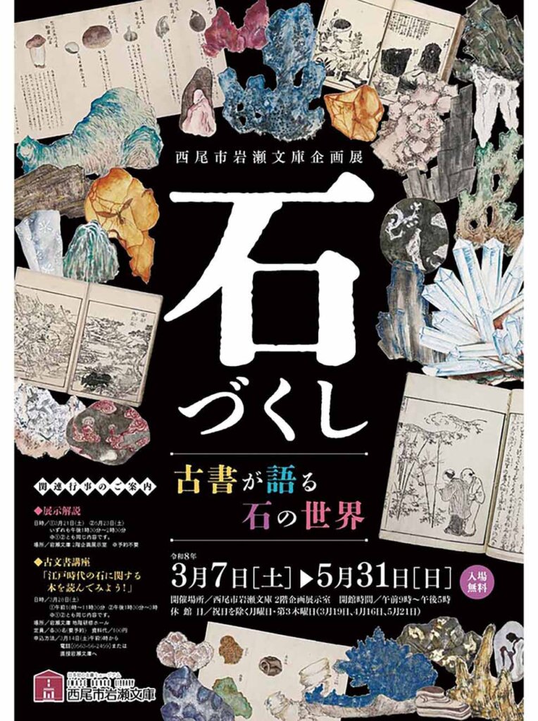 石は、道具や装身具、芸術、医療、建築素材など、人類の歴史の中で古来より大きな役割を担ってきました。一方、自然が生み出す奇妙な形や美しい模様は人々の心を惹きつけ、信仰や鑑賞の対象にも。本展では岩瀬文庫の蔵書を通して、人々を魅了した石の世界を紹介します。