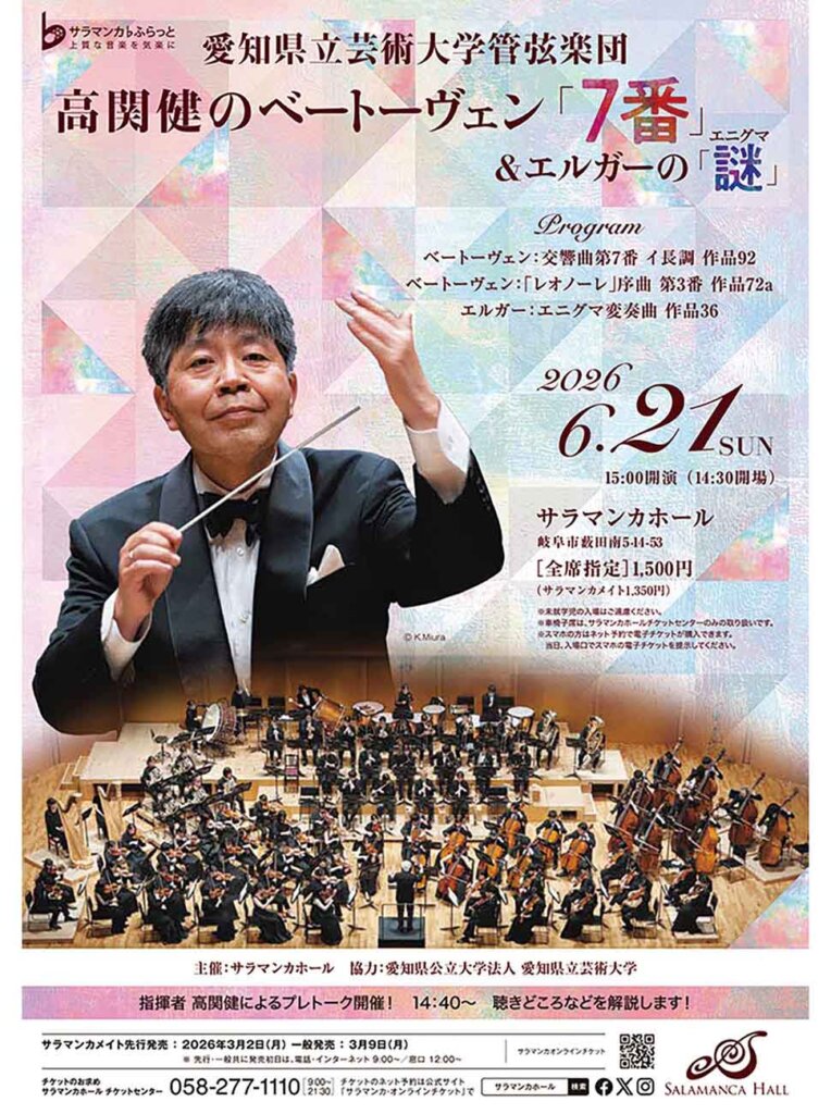 サラマンカホールでは、若い演奏家を応援するプロジェクトとして、愛知県立芸術大学と提携した公演を定期的に企画。今回はベートーヴェンの「交響曲第7番」、エルガー「エニグマ変奏曲」。2026年度愛知県立芸術大学客員教授に就任する高関健が、若き演奏家たちと取り組む新しい音づくりにご期待ください。