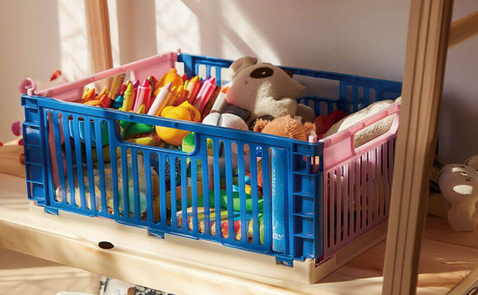 ボックス同士を積み重ねて使用でき、使わない時は平らに折りたためるため、スペースを有効活用できます。文房具からキッチン用品、おもちゃまで幅広く収納できます。