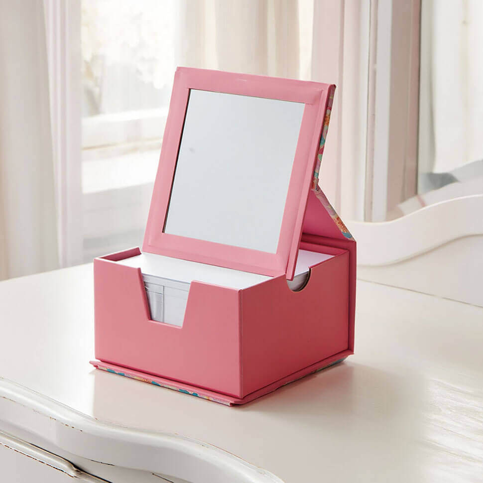 メモ用紙と収納ケースがセットになった文房具アイテムです。フタの裏にミラーが付いており、身だしなみチェックにも使えます。