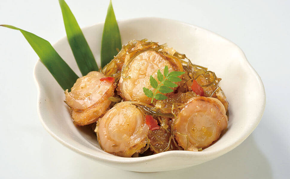 プリッと食感の北海道産ベビーほたてをたっぷり入れた、贅沢な松前漬です。