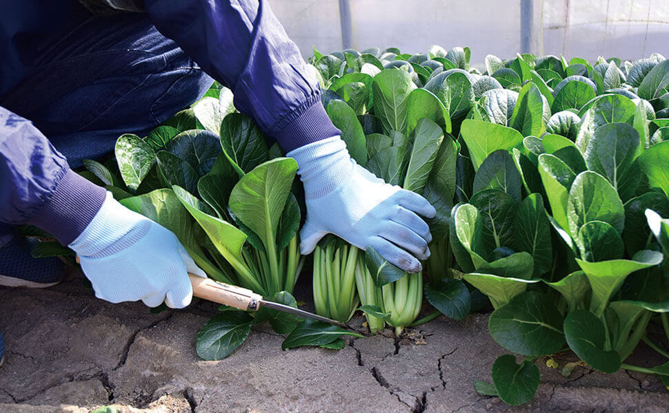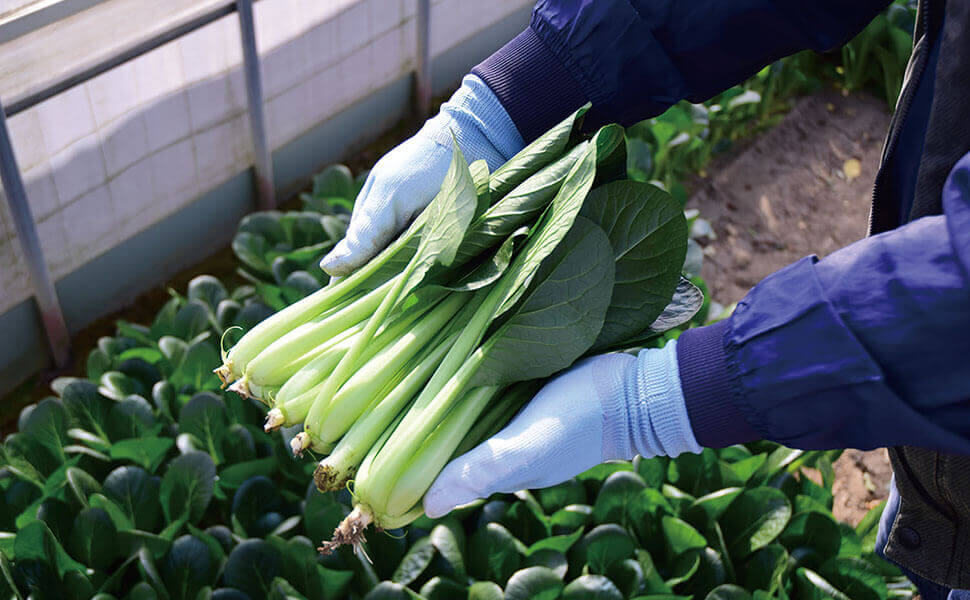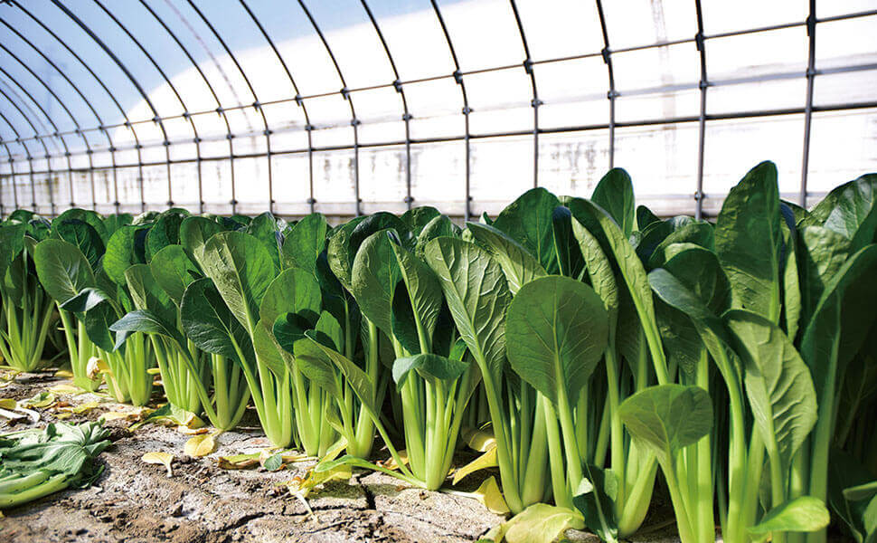 土壌や水はけ、気候などハウス栽培に好条件な神戸町では、小ねぎやモロヘイヤ、水菜など多くの葉物野菜が育てられています。その中でも小松菜は年中栽培されており、地域を代表する野菜の一つです。