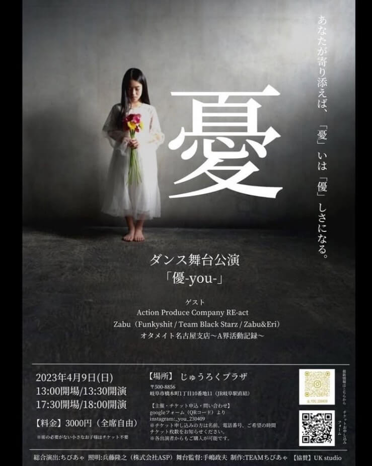 そして、中林さんが初の自主公演を開催。2023年といえば、まだまだコロナ禍も収まらない時期。「やったことがないのにできないのは嫌、そしてやらずに終わるのも嫌。だからまずはやってみようと思った」と話す中林さんが主催したのは、2023年4月9日(日)に岐阜市じゅうろくプラザで行われたダンス舞台公演「優 -you-」。『あなたが寄り添えば、「憂」いは「優」しさになる。」をテーマに、数々の作品で観客を魅了し大盛況の中終演しました。中林さんは、自身のSNSの中で思っていた以上に舞台公演は「人生」そのもので、苦しいときも、初めてダンスを辞めたいと感じたときもあった、しかしその中で築いてきた周りの人に支えられて改めて気づかされたこともあったと振り返っていました。自分にもストイックで、精神的にも体力的にも自身を追い込みながらも1つ1つ乗り越え、形にして、表現していったのだと感じます。
