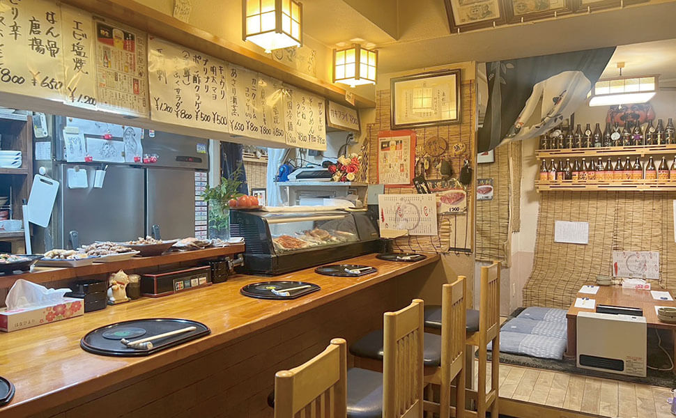 ふぐ鍋など季節の鍋料理やお刺身、豚足、手作り和惣菜が楽しめる「居酒屋ふくふく」。野村さんご夫妻の温かい接客と常連さんでにぎわう活気ある雰囲気が魅力。