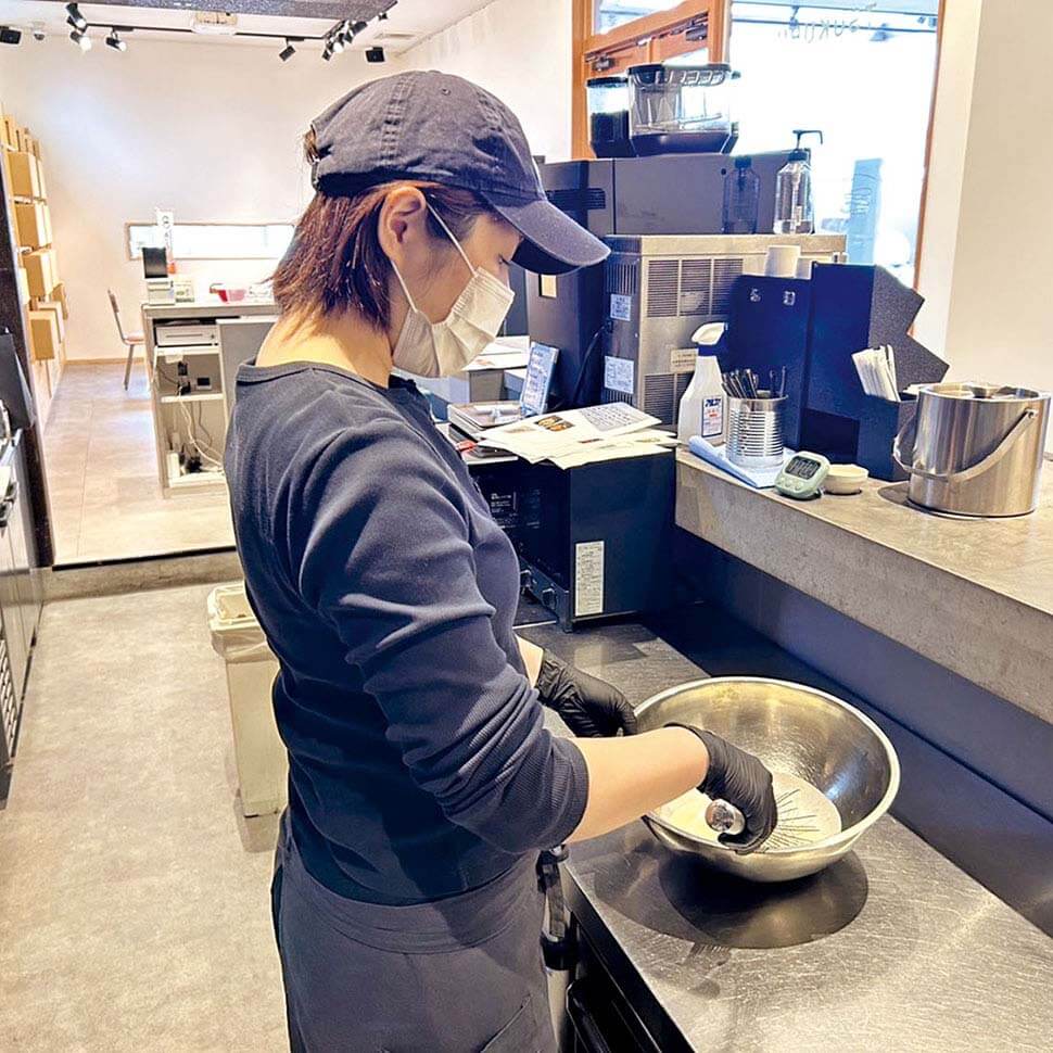 主にスイーツをメインに担当する中川さんは、「1g単位の配合で味が変わるため、毎日試行錯誤を重ねていますが、調理師・製菓衛生師の資格を活かし、自分のレシピが形になるのが楽しいです!」と話します。2026年春のオープンに向けて、メニューの準備を整え、自信を持ってお客様に提供できるように練習を重ねているそう。スタッフ皆さん活気があり笑顔溢れる職場、カフェのオープンが待ち遠しいですね♪