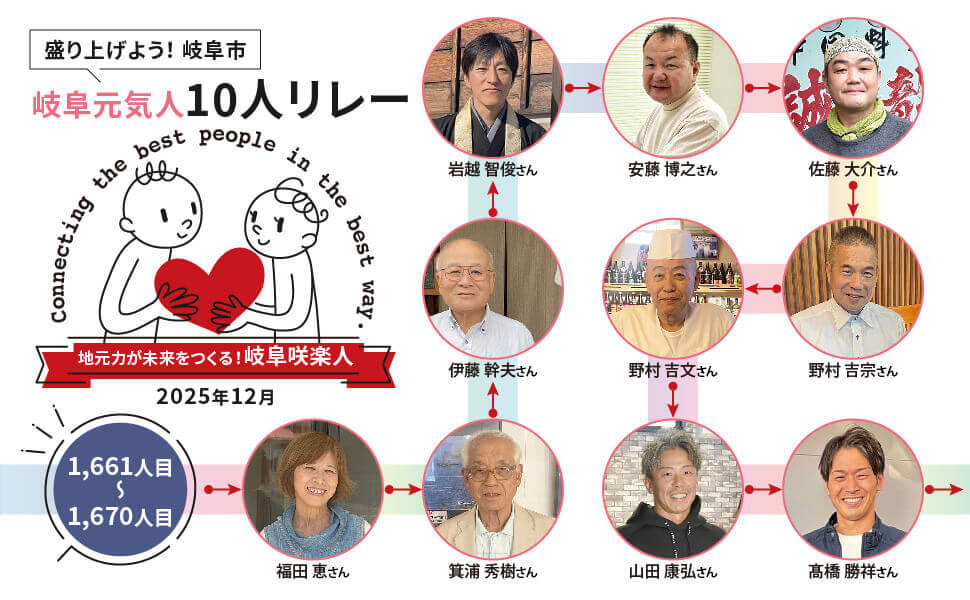 岐阜を愛し、日々の活動を通して岐阜を盛り上げている方々をご紹介する「岐阜元気人月元気人リレー」。毎月10名の素敵な方々が、それぞれの繋がりでバトンを繋いでいきます。岐阜のあちこちで笑顔と活力を生み出すきっかけになれば嬉しいです。