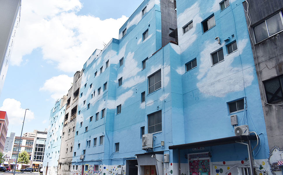 ビルビルの壁面に空やカラフルな円形が描かれる(©️SAKURA編集部)