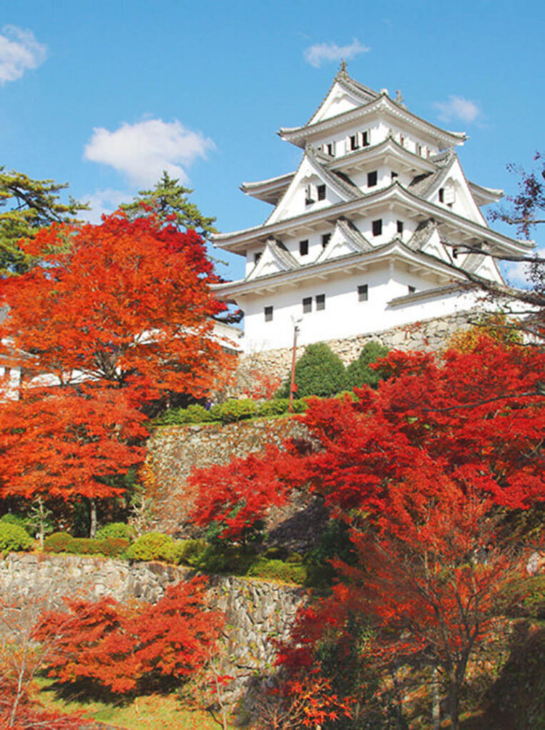 それから後に幕末・明治維新と多くの動乱を受け、城は取り壊しとなり、長らくは「野良積み」という手法の石垣だけ取り残された状態が続きましたが、昭和8年(1933年)に木造の模擬天守が再建されました。木造の再建城としては日本最古。周辺を彩る樹木が四季折々にいろいろな表情を見せてくれる中、秋の紅葉は「天守炎上」と例えられるほど見事な白亜天守とのコントラストを表現します。また五階建ての天守閣の最上階から城下町を見下ろすと、魚のような形になった町並みが見られます。