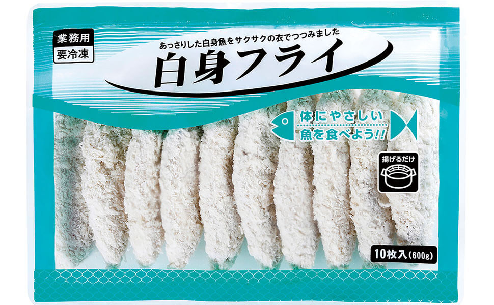 白身魚をパン粉で包み、あっさり塩味のフライ。凍ったまま油で揚げるだけで、サクサクの衣に包まれた白身フライをお楽しみいただけます。