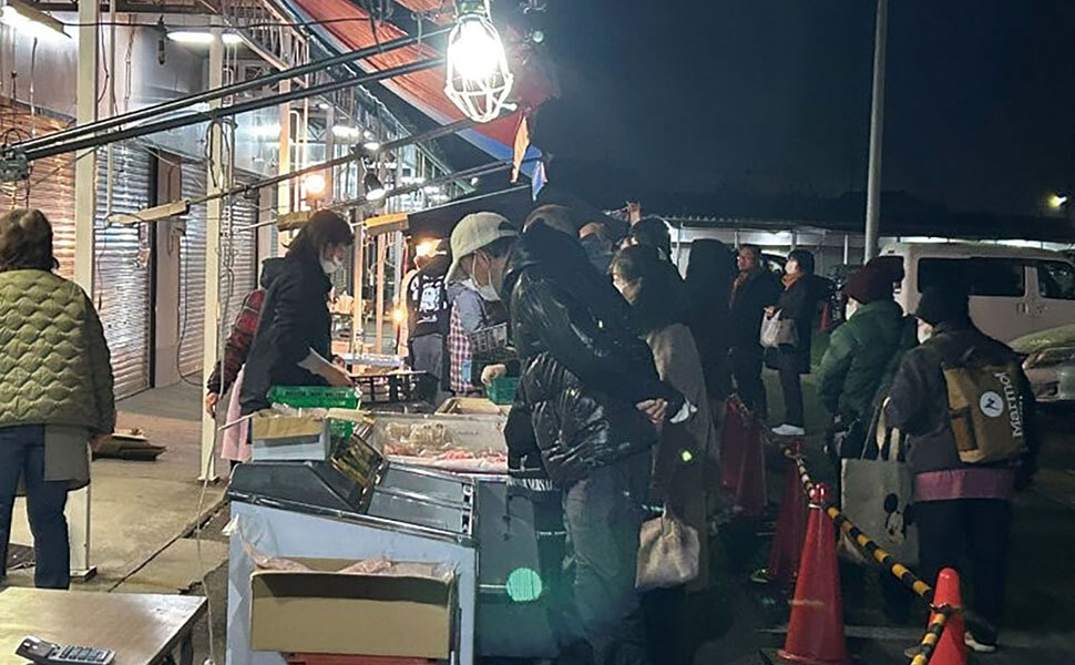 補足が入りますこの文章は例年、ズワイガニやタラバガニなどの魚介類のほか、地元の生産者が栽培したダイコンやハクサイなどの取れたて野菜が所狭しと並びます。