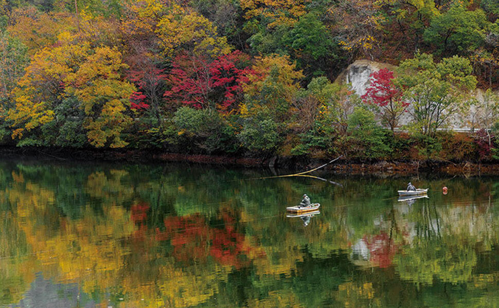 一年を通じて四季折々の変化が楽しめる伊自良湖は、秋が絶好のシーズン。周囲2.4km、54万トンの水量を湛えた人造湖にうつる逆さもみじが美しいと評判です。伊自良湖の水は、農業用水として利用されるほか、ワカサギの放流も盛んに行われ、秋から春にかけてゆったりとワカサギ釣りが楽しめます。