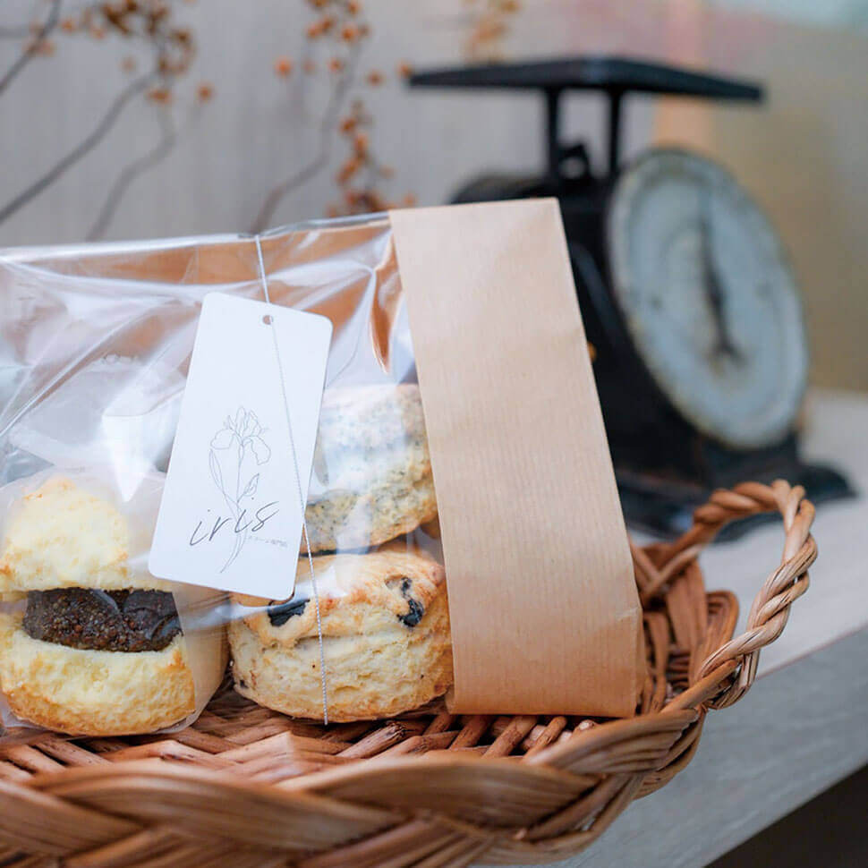 旧中山道沿い鏡島小学校より北へすぐのところにあるスコーン専門店『iris(アイリス)』では、毎朝約70個、5~6種類のスコーンを13時までに焼き上げています。