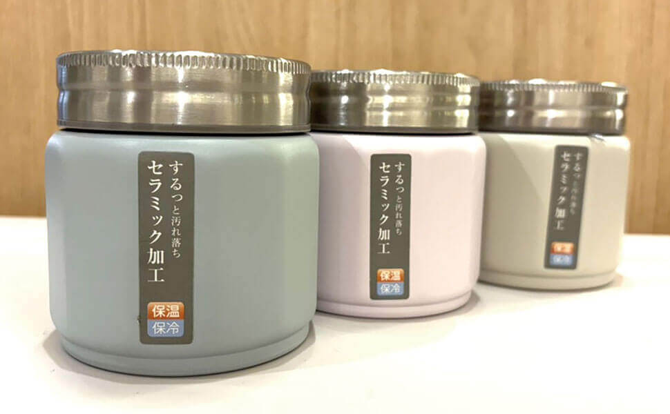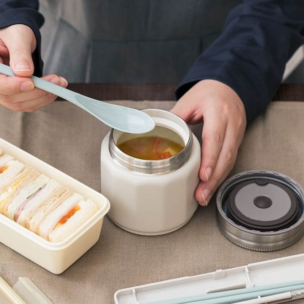 内側はするっと汚れが落ちて具材が見やすい、白色セラミック仕上げ、真空二重構造でしっかり保温保冷ができるスープジャーです。本体は12角形の形状なので、フタを開けるときに持ちやすいデザインになっています。淡い色合いも春らしくかわいいアイテムです。