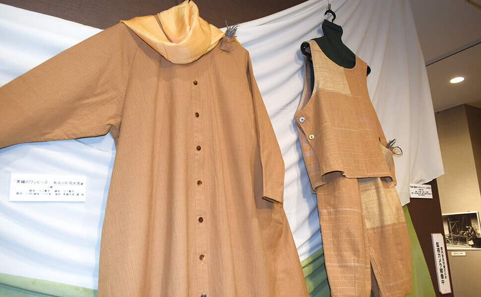 茶綿で織ったワンピース(左)、ベストとパンツ(右)。