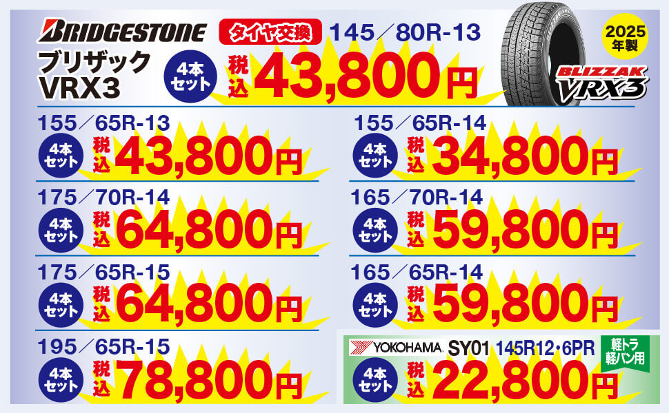 工賃・バランス・バルブ交換・廃タイヤ処理・消費税、すべて込み!