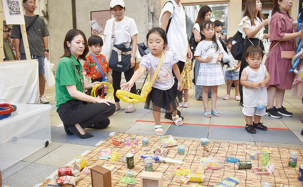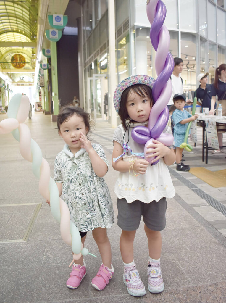 柳ケ瀬グラッスルにはテーブルサッカーやエアホッケーの木製遊具が用意され、子どもたちはゲームにエキサイト。柳ケ瀬本通りでは、輪投げやスーパーボールすくいなどの縁日遊びを楽しんだほか、ウォータービーズとミサンガを作る体験もあり、アーケード街は歓声がこだましました。