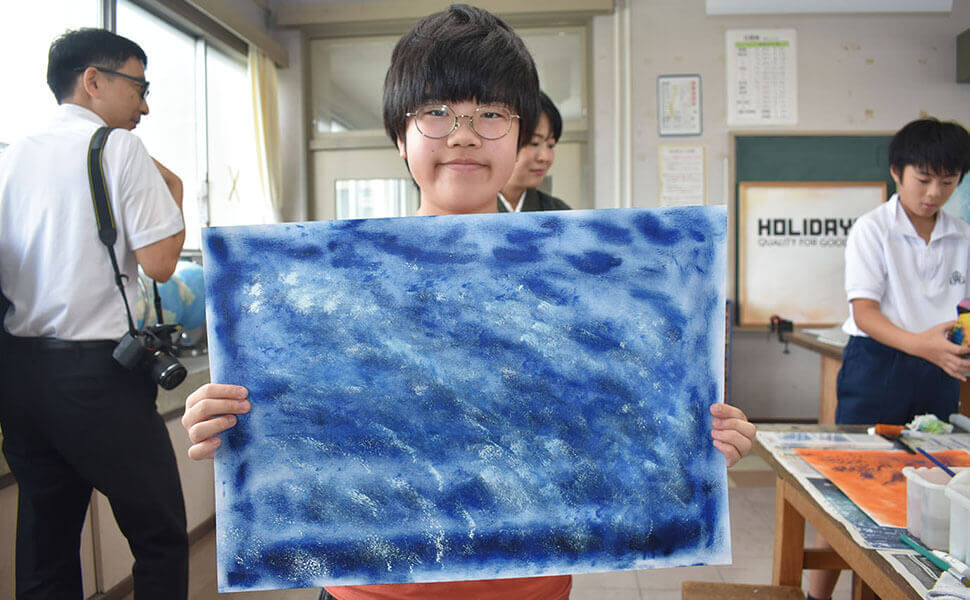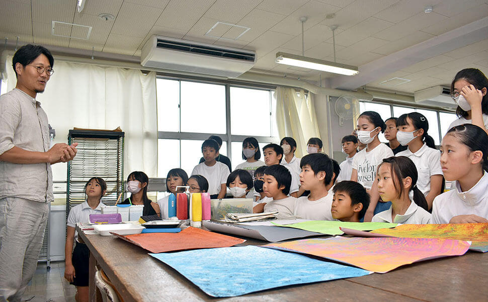 水彩絵の具は3色のみ。絵筆は使わず、スポンジだけで描くアート作品に挑戦したのは、大垣市立興文小学校の6年生たち。講師は大垣市在住の自然素材画家・足立陽平さんで、簡単にできるエイジング塗装の技法をレクチャーしました。まずはベースの色を画用紙全体に塗り、次いでスポンジを使って別の2色を加えていけば、わずか10分足らずで表情豊かな作品の出来上がり!子どもたちは夢中になって取り組み、数多くのアート作品を誕生させました。なお、同授業では、足立さんの作品鑑賞や職業講話も行われました。