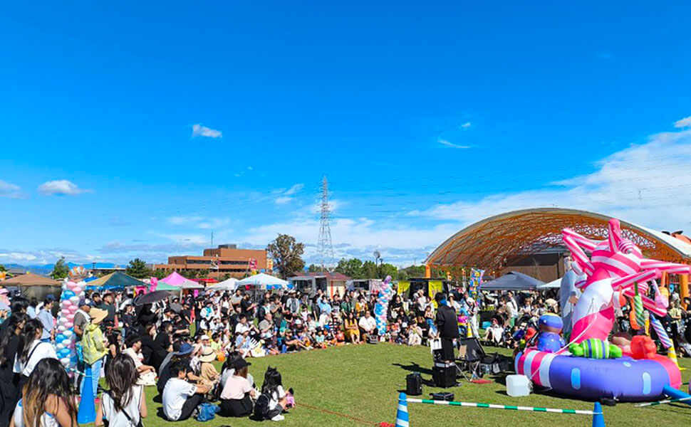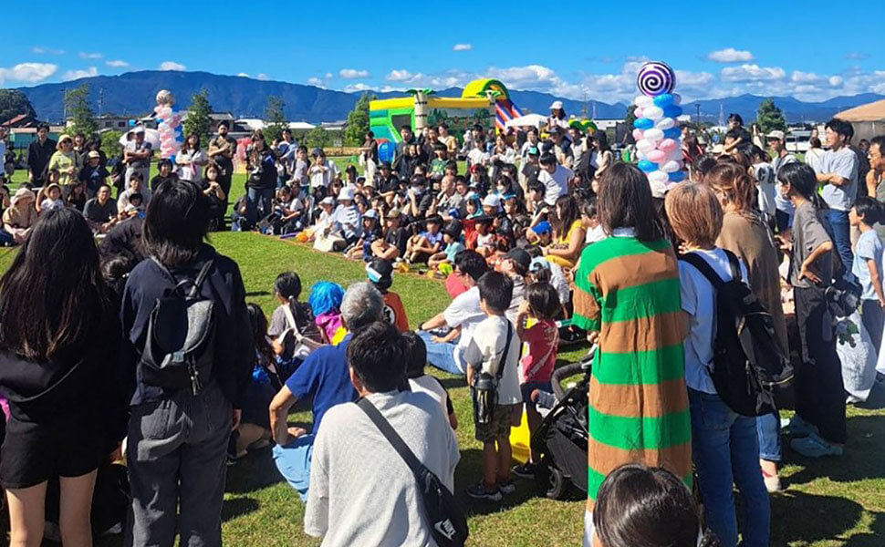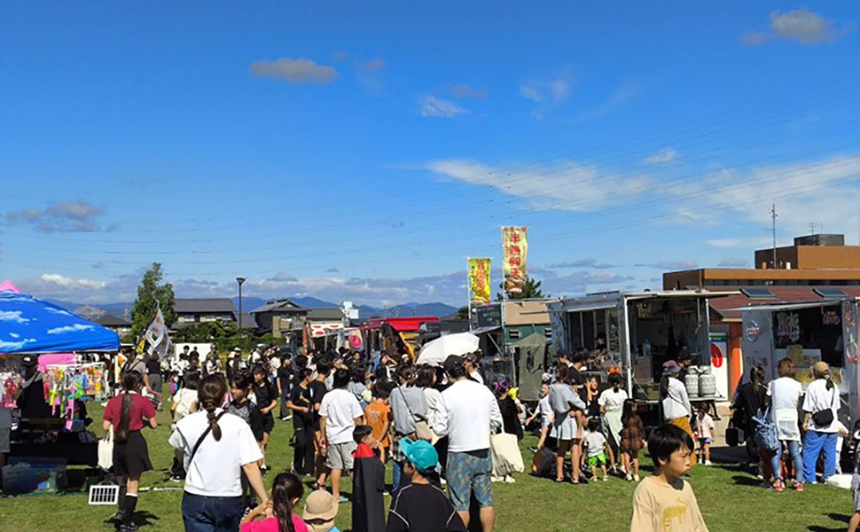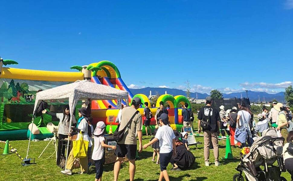 飲食やワークショップのほか、遊具なども設けた充実のマルシェ。山県市などで開催しており、“動くテーマパーク”と言われています。子どもたちに大人気のフワフワドームも登場!