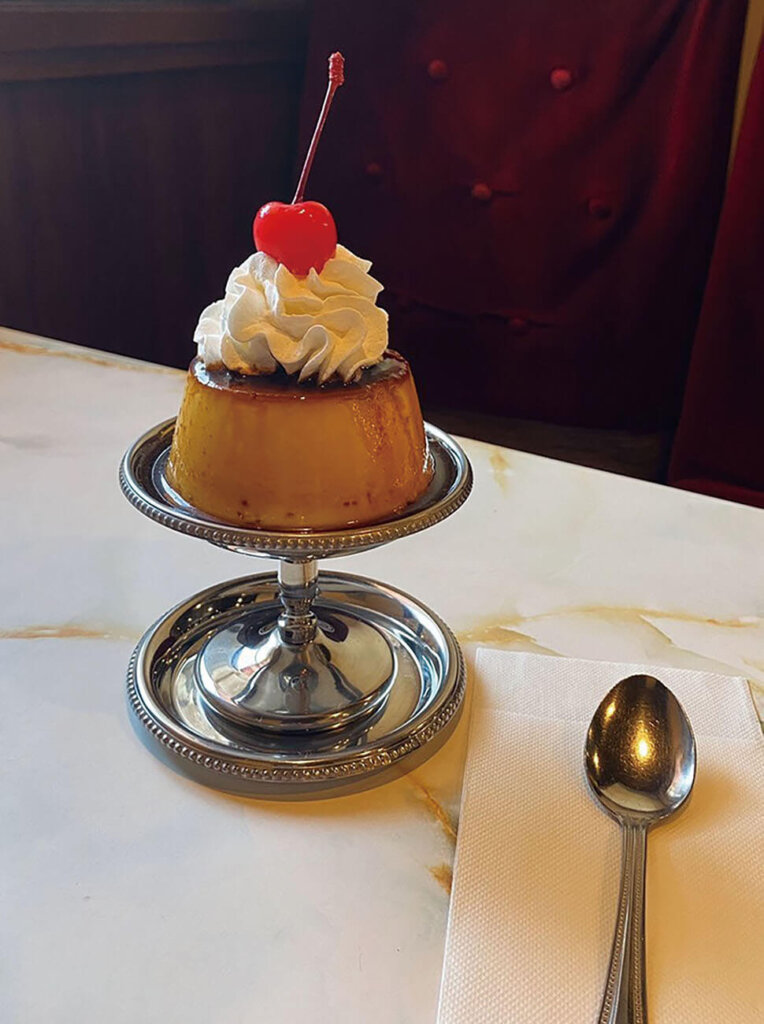 食感は硬めで、カラメルのほろ苦さと生クリームの甘みがベストマッチ。プリンの上にはさくらんぼが乗っています。銀食器が使われているのも、レトロさ増しで可愛いです♡