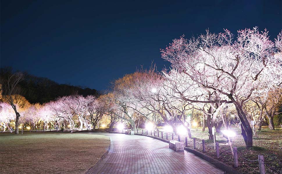 約50種1,000本の梅の木が植えられている梅林公園では、2026年も「ぎふ梅まつり」が開催されます。写生大会や写真教室、人力車の運行などのイベントも目白押しです。2026/2/10(火)~3/15(日)の期間中、17:00~20:30までの間は梅の木が美しくライトアップ。芝生広場では梅花をイメージした光の演出も行います。光に照らされた梅花が光り輝く様子を、ゆっくりと散策しながらご鑑賞ください。