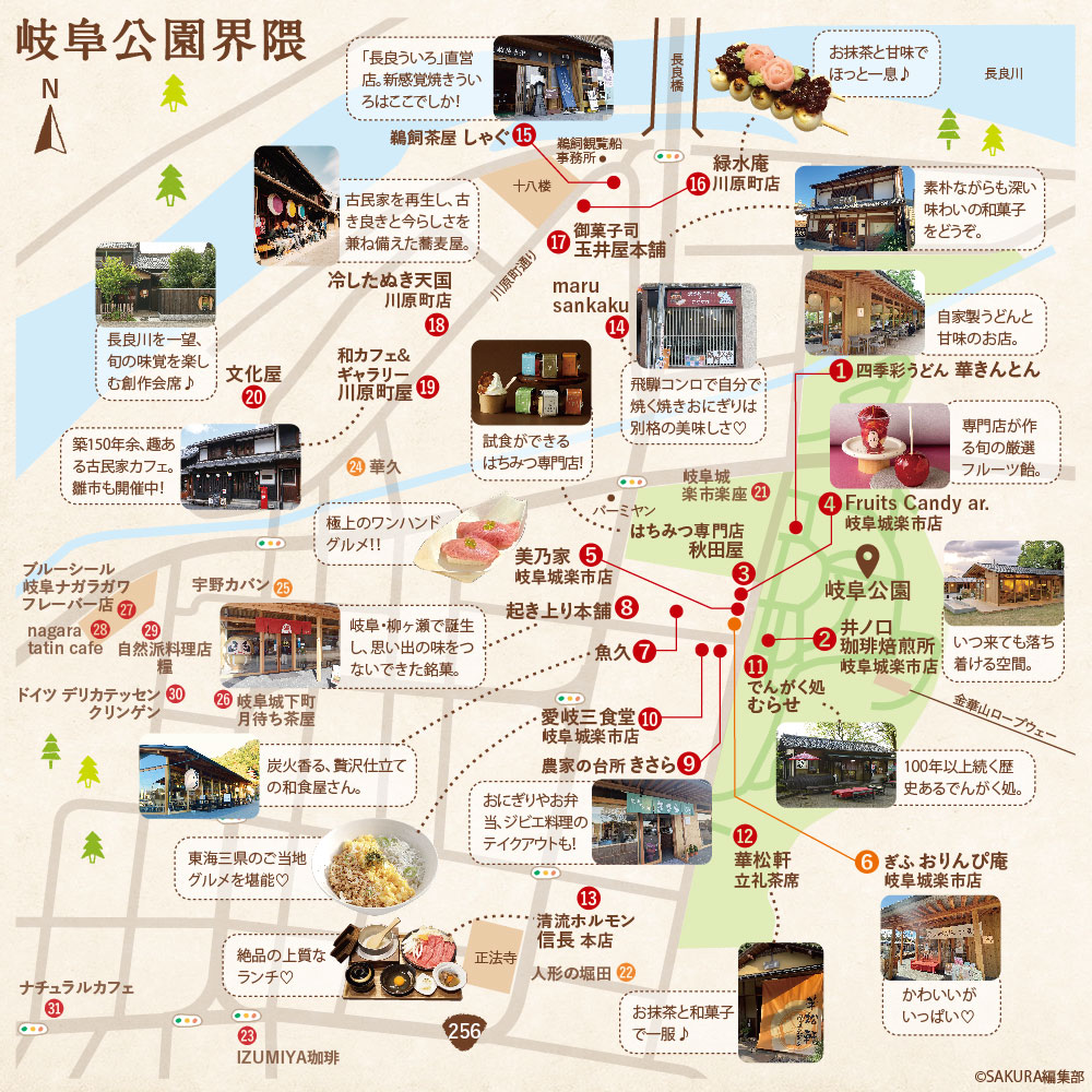 岐阜公園内に2025年4月にオープンした「岐阜城楽市」。その近くには、ここ数年町屋を利用したモダンな飲食店なども登場している「川原町」。岐阜の魅力が感じられる注目スポットが多数ある『岐阜公園』界隈を巡ってみませんか。