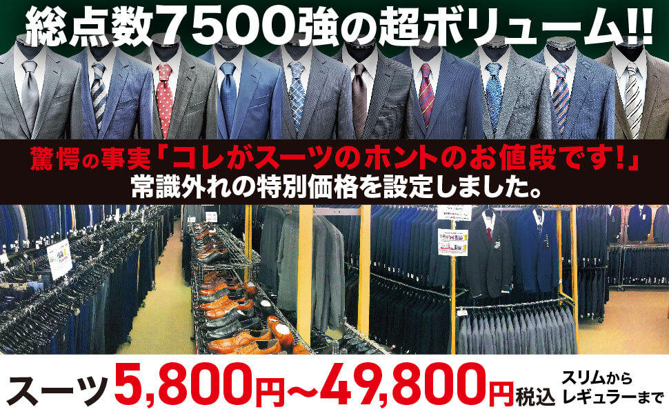 スリムからレギュラーまで スーツ5,800円~49,800円税込