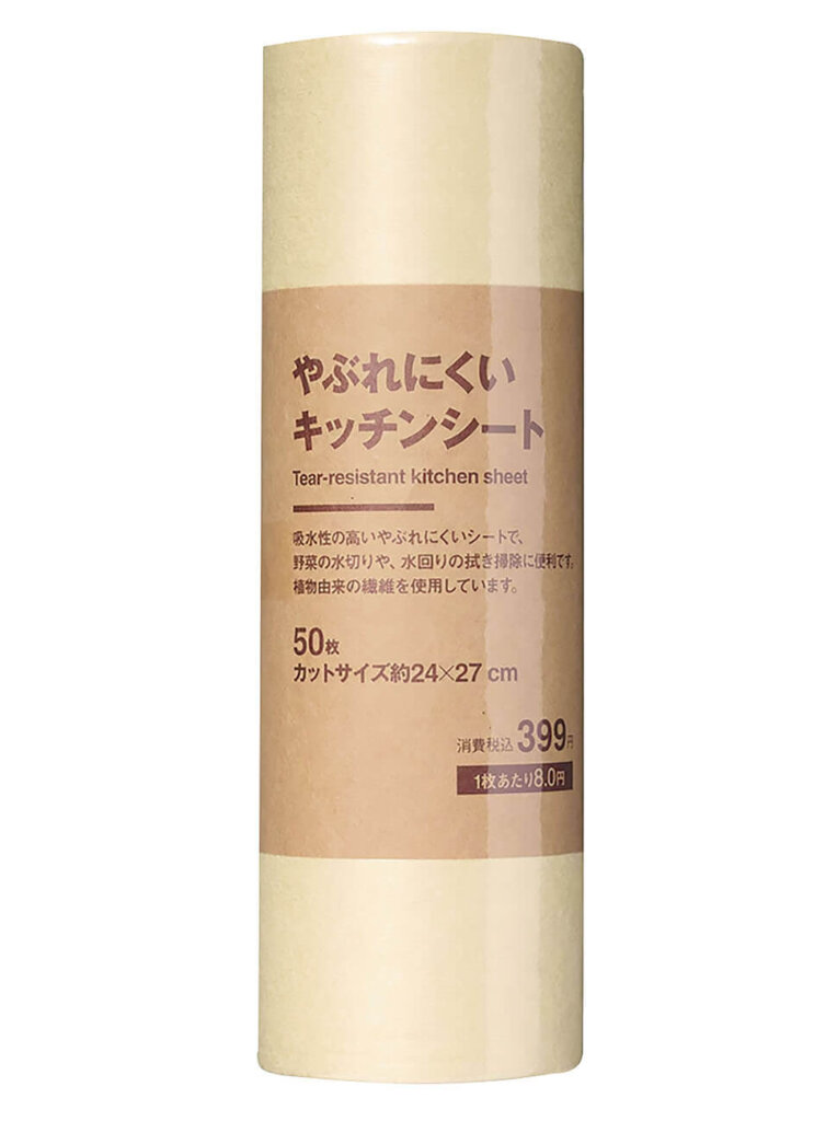 吸水性の高いやぶれにくいシートです。ロール式で1枚ずつ切り取りやすく、野菜の水切りや、肉・魚の水分取り、水回りの拭き掃除など、さまざまなシーンで活躍してくれる万能アイテム。植物由来の繊維を使用しているので、安心して使えます。