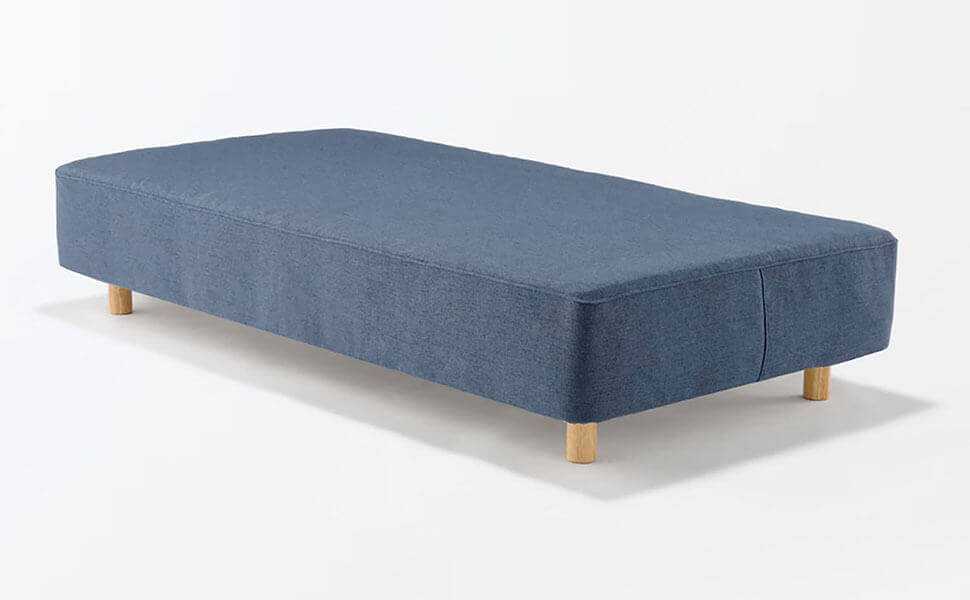 フレームが無く四方のどこからでもアクセスでき、ベッドにもソファにもなる汎用性が特長です。マットレスが圧縮仕様、スチールフレームが組立式で、搬入のしやすさもポイントです。