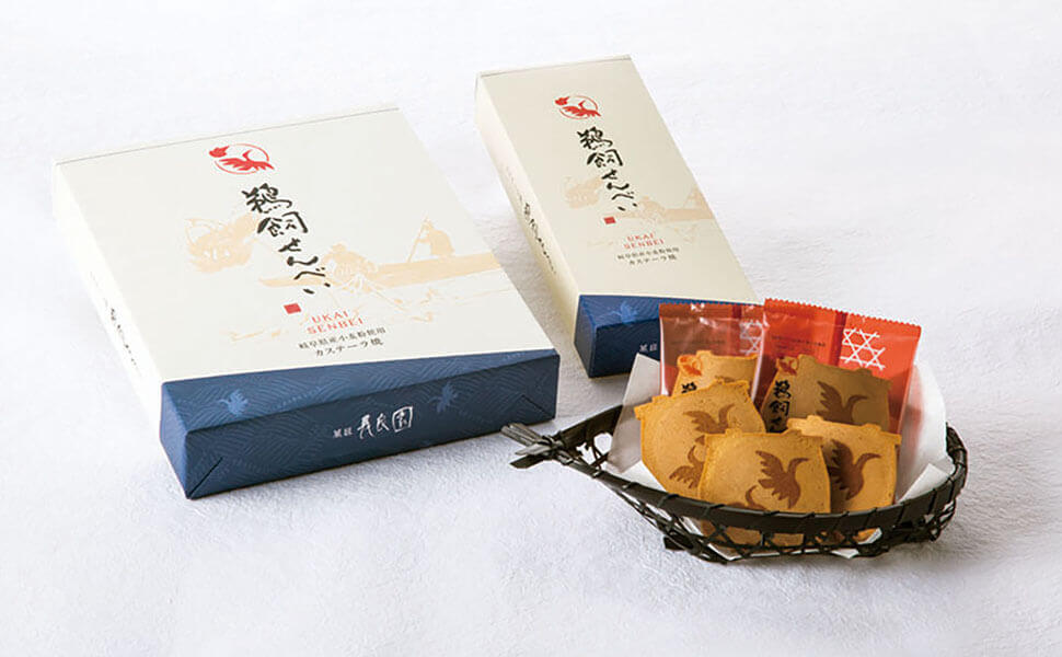 長良川鵜飼の鵜籠をモチーフにした玉子せんべい。岐阜の小麦粉や卵を使用した、どなたにも好まれる優しい味わい。
