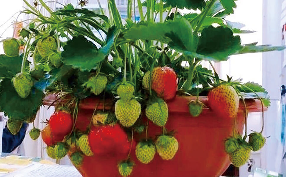 スリットが入った壁掛けバスケットに苗を植えこむ