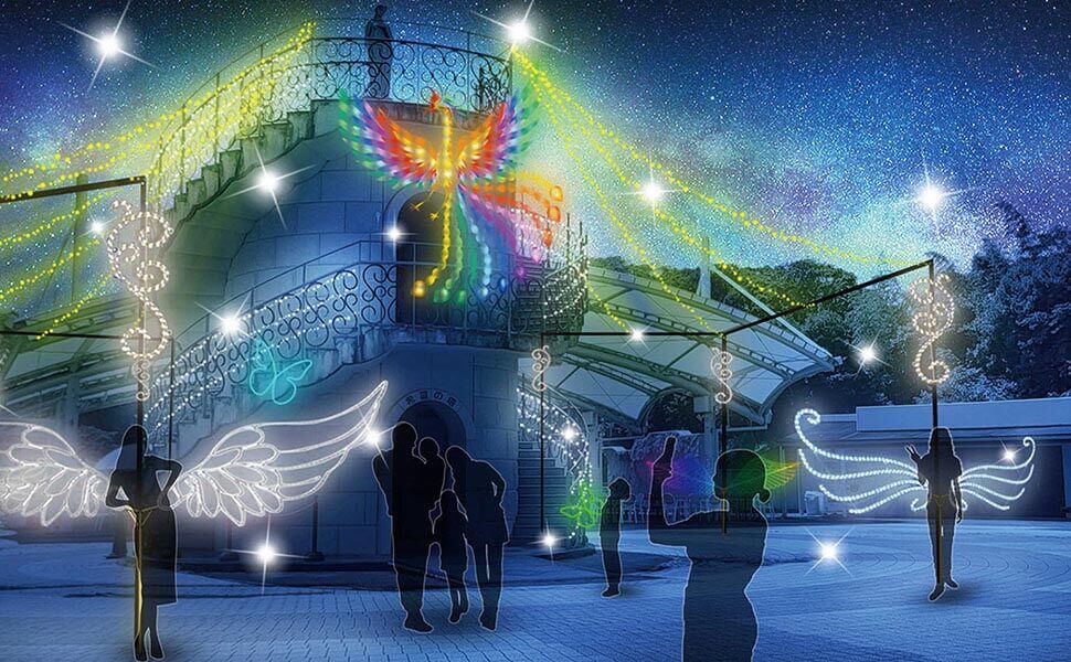 幸運や成長のシンボルとされる蝶と一緒に園内をめぐりながら、最奥にたたずむフェニックスへ向かいます。道中で「見る・感じる・体験する」といった光の演出があり、未来が明るく希望で満ちていると感じられるイルミネーションが楽しめます。「新芽たちの遊び場」は踏むと音のなるパネルなどで遊べ、「フェニックス」は神々しく飛び回るフェニックスが見られます。