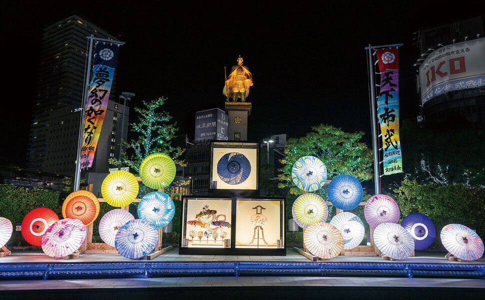 LED約20万球のイルミネーションで岐阜駅前などが美しくライトアップされます。岐阜の伝統工芸品である岐阜提灯、岐阜和傘のほか、美濃和紙で製作された「のぼり鯉」の展示を行い、岐阜らしさあふれる空間を演出。岐阜農林高校による瓢箪(ひょうたん)イルミネーションが大階段を彩ります。金公園などでもイルミネーションが展示されます。
