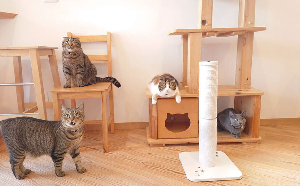 キャットウォークや駆け回る姿、まわし車で楽し気に遊ぶ様子など、豊富な猫用遊び場でみられる個性豊かなかわいい猫たちのしぐさに癒される!木の温もりに包まれた優しい空間の猫カフェで、穏やかに流れる自分だけのご褒美時間を過ごしましょう♡