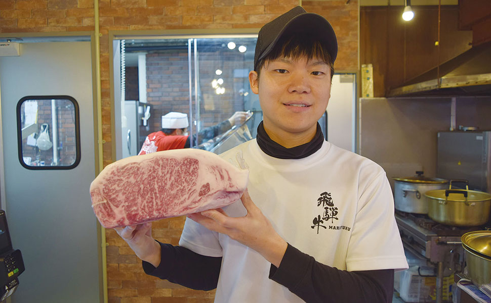 JR岐阜駅から徒歩10分の場所にある創業72年の老舗精肉店の「肉の丸福本店」。飛騨牛は目利きのベテランが毎週開催される競りで一頭買いしています。昔からのファンが多いほか、オンライン販売で全国へ飛騨牛を届けています。