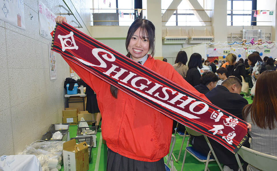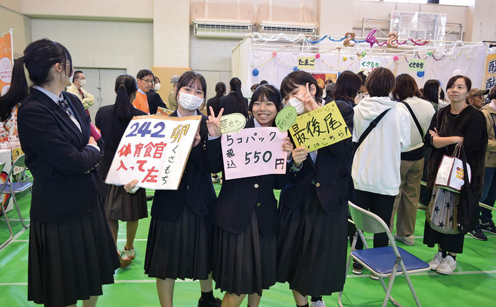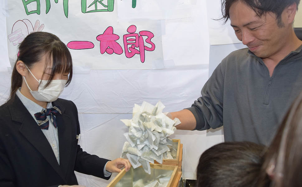 全校生徒が模擬会社を設立し、仕入れから販売までを行う商業実習の伝統行事。野菜や和洋菓子、ドリップコーヒーといった食品のほか、衣料品に軽乗用車なども販売し、てきぱきと接客をしていました。