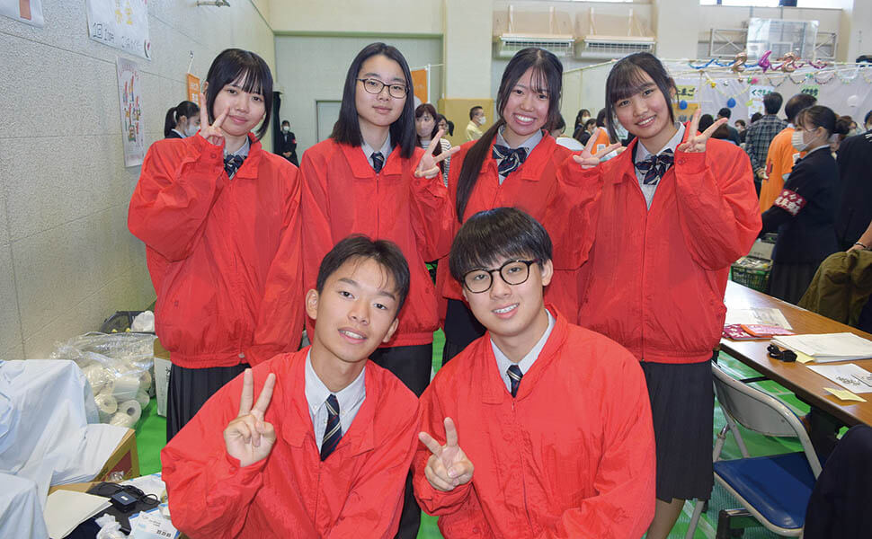 取締役社長の小田萌乃華さん(後列左から2人目)ら市岐商デパートの役員の生徒。(©️SAKURA編集部)