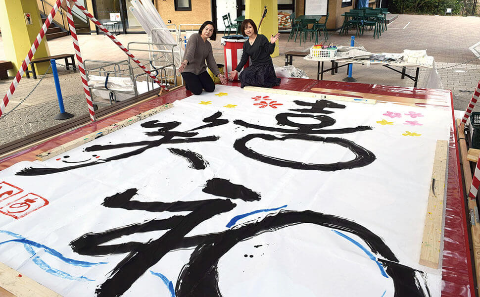 スーパージャンボ用紙(4×2.8メートル)、ジャンボ用紙(3×1.6メートル)に特大筆を使って、書に挑戦。家族や友人のグループは慎重に筆を運びながら、思い思いの文字を書きました。
