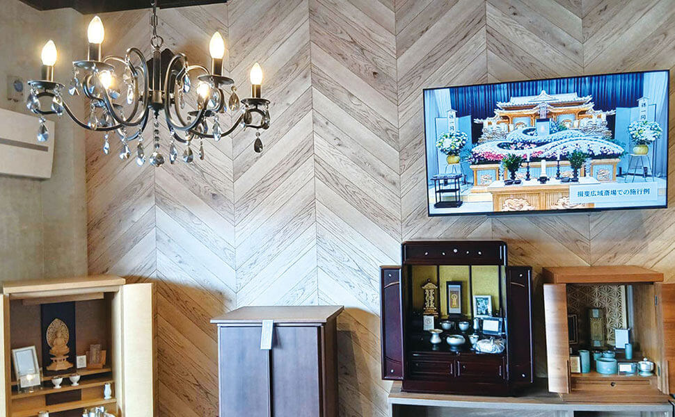 ”葬儀サロン”ということもあって、店内には、お仏壇・仏具や遺骨を入れて身に着けるソウルジュエリーなどの展示や葬儀・相続相談の資料も揃っています。